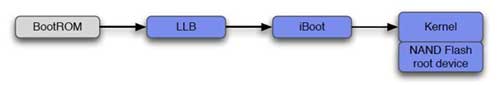 When an iPhone boots up, it walks through a chain of trust which is a series of RSA signature checks among software components in a specific order as shown below.
