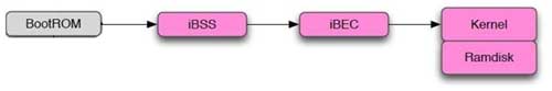 In DFU mode, iPhone follows the boot sequence with a series of signature checks as shown below. BootRom signature checks the second level boot loaders (iBSS, iBEC). Boot loader signature checks the kernel and kernel signature checks the Ramdisk.