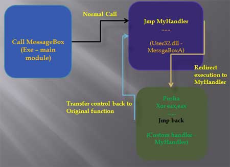 As you can see in the above picture that the MessageBox function starting bytes are overwritten by JMP to MyHandler function. In MyHandler function we do our stuff and then transfer the control back to original function i.e MessageBox.