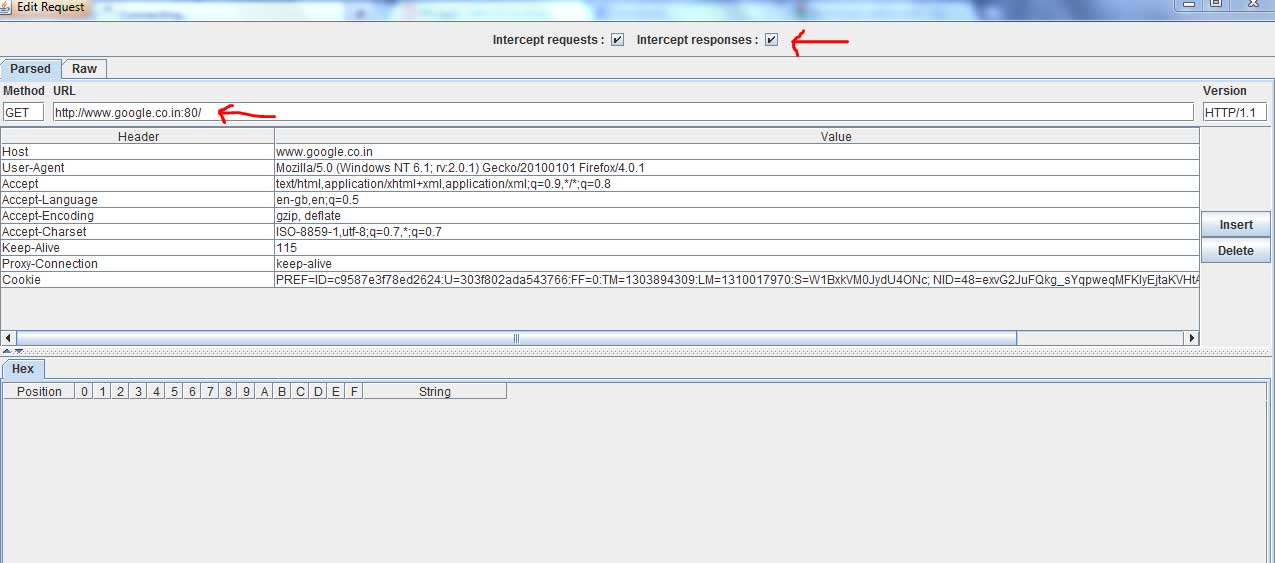 Next, launch your browser & type any URL for example, http://google.com. You will see a window in WebScarab that will show the intercepted HTTP Get request as shown below. At this point you can also click on the "Intercept Response" button so that it can also intercept the response that is coming back from the Google web server.