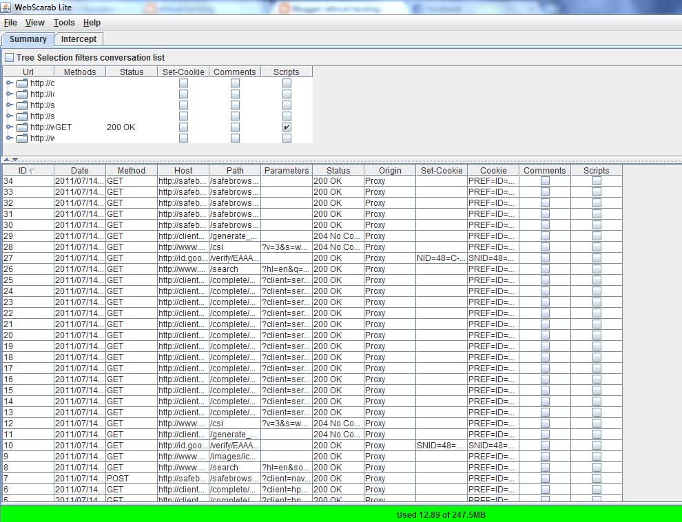 At the end, you can click on the "Summary" tab in the main window of the WebScarab which shows complete details of all the intercepted requests and response as shown in the screen below.
