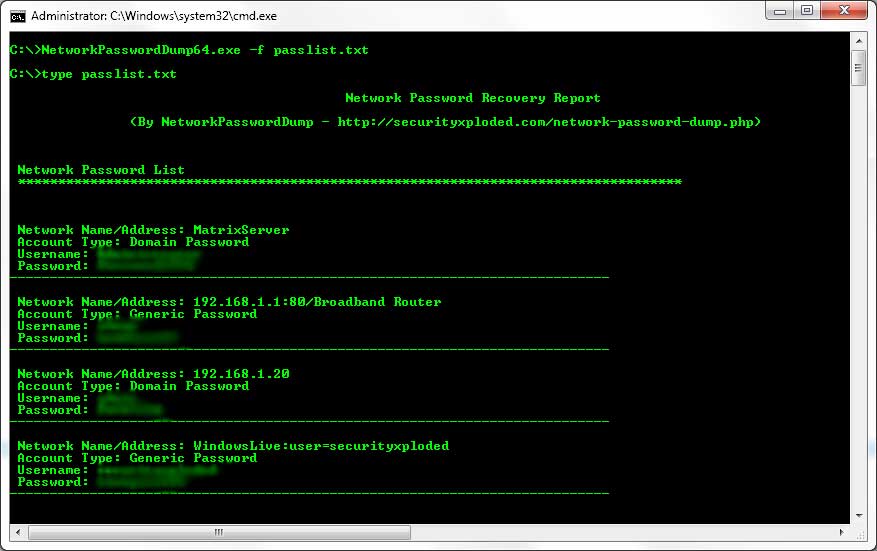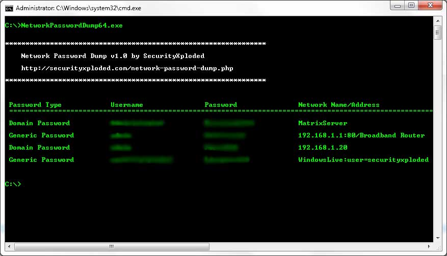 Network Password Dump is very easy to use tool. It is command-line/console based tool, hence you have to launch it from the command prompt (cmd.exe).