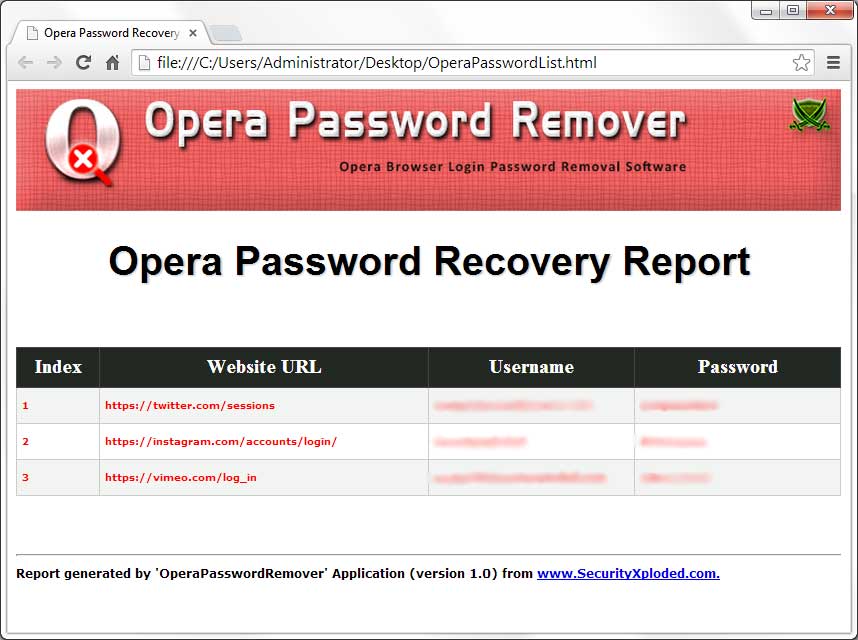 Opera Password Remover is designed to help users to protect their privacy and online security by recovering & removing the password from Opera login database. But like any other tool its use either good or bad, depends upon the user who uses it. However neither the author nor securityXploded will not be responsible for any type of loss or damage caused due to usage of this tool.