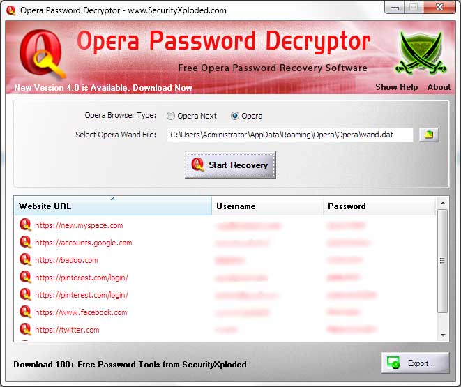 Opera Password Decryptor is the FREE tool to instantly recover the passwords stored by all versions of Opera browser.