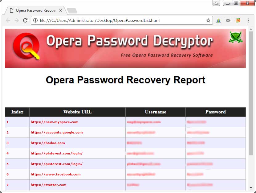 Screenshot 2: Opera recovered password list exported in HTML format by OperaPasswordDecryptor.