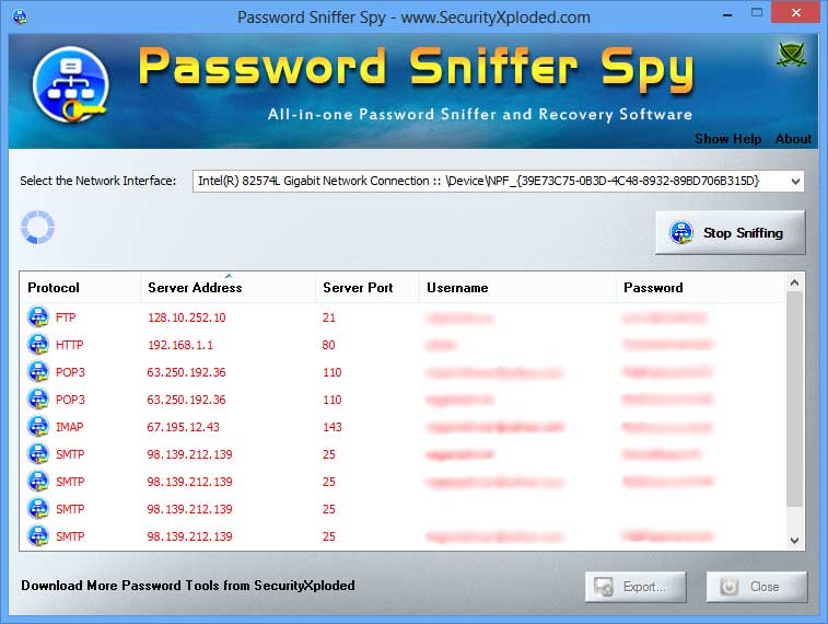 Password Sniffer Spy is the all-in-one Password Sniffing Tool to capture Email, Web and FTP login passwords passing through the network.