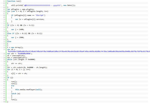 This particular sample splits javascript into three streams and concatenates them using <</Names[(1)6 0 R (2)7 0 R (3)8 0 R]>> which will eventually refer to three objects marked in red. After beautification, it seems it is exploiting one vulnerability existed in  Adobe Reader namely this.media.newPlayer(null).
