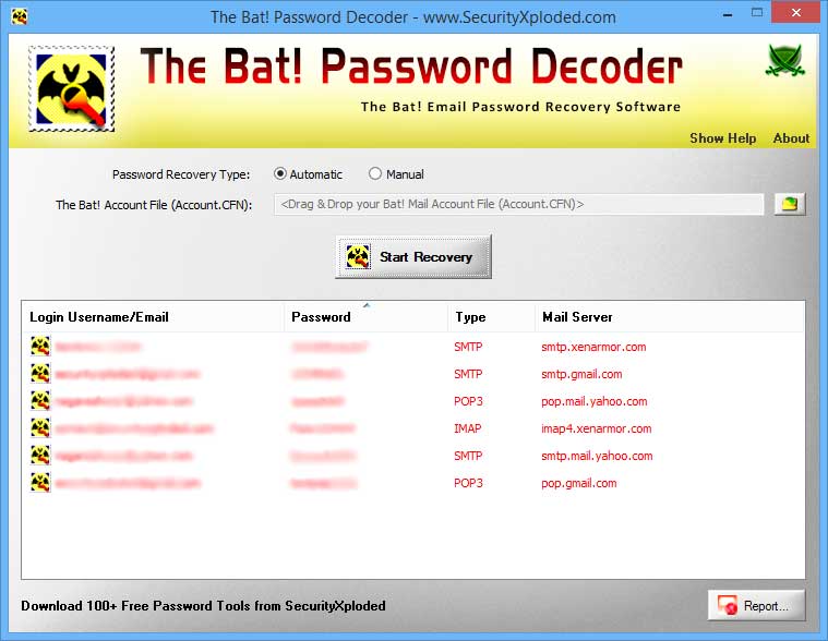 The Bat! Password Decoder is not a hacking tool as it can recover only your stored passwords. It cannot recover the passwords for other users unless you have right credentials. Like any tool its use either good or bad, depends upon the user who uses it. However Author or SecurityXploded is not responsible for any damage caused due to misuse of this tool.